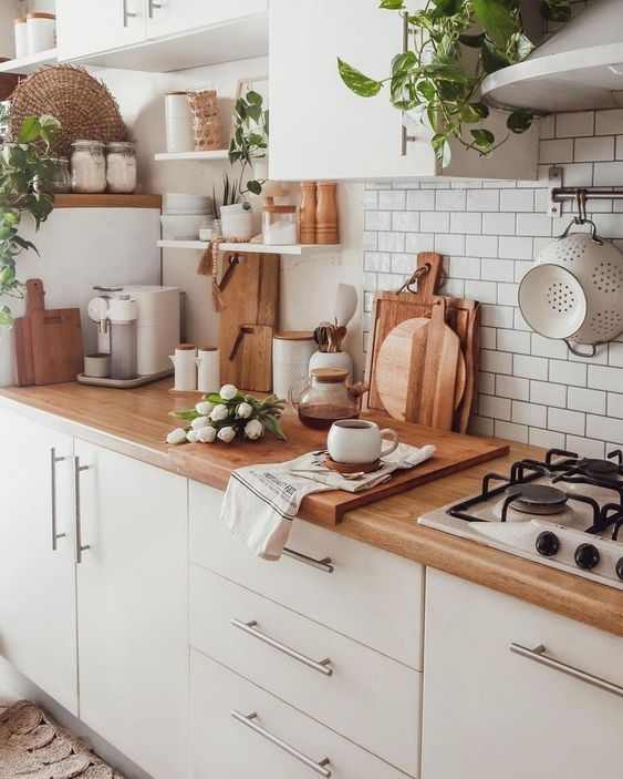 Embracing a simple yet inviting aesthetic, this kitchen pairs warm wooden countertops with crisp white cabinetry. The open shelves offer a place to display beautiful kitchenware, while potted plants add a touch of greenery, creating a feeling of a cottage core setting. This space is all about warmth and welcome, a true farmhouse feel with a clean, modern edge.