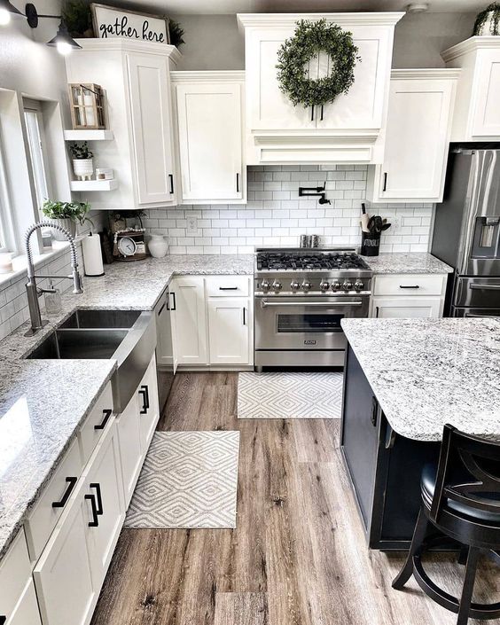 Starting our list is a kitchen that blends timeless elegance with modern functionality. The stark beauty of white cabinetry is softened by wooden accents, creating a kitchen that feels both familiar and fresh. This space uses classic design elements like Shaker cabinets and marble countertops, elevated with modern touches such as gold hardware and recessed lighting, showcasing a blend that will stand the test of time.