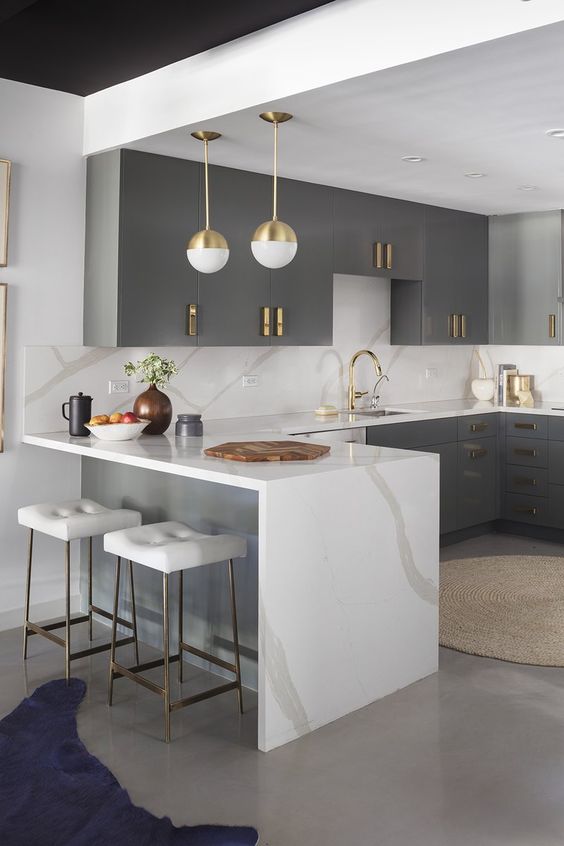 Here we see the epitome of minimalist design with sleek lines and uncluttered surfaces. The use of metallic frames around the shelving adds a touch of luxury without overwhelming the space. Plants are strategically placed, adding a dash of greenery, and the compact bar stools ensure that this small kitchen remains functional and stylish.