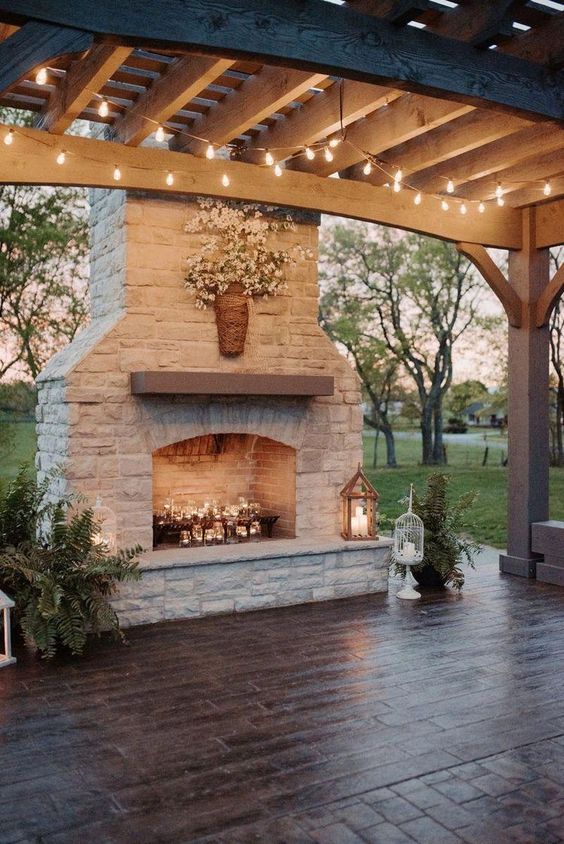 The barndominium ideas exterior of 2024 embraces the beauty of the outdoors. Here, we see a haven designed for those tranquil evenings under the stars. The stone fireplace adds a touch of tradition, while the strung lights keep the ambiance contemporary and inviting. This space is for those who dream of barndominium ideas that make every evening an occasion.