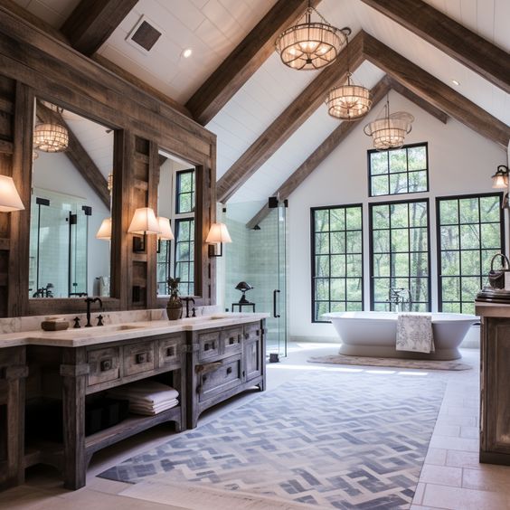 Step into a master bathroom that defines luxurious simplicity. This barndominium ideas interiors concept is all about spaciousness and light, with high ceilings and large windows that invite nature inside. The standalone tub and rustic vanities speak to those who appreciate barndominium ideas interiors rustic with a dash of opulence.