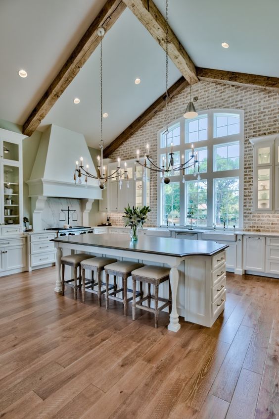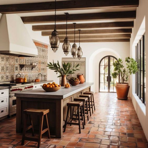 For those dreaming of a Mediterranean escape, this kitchen offers a daily getaway. The terracotta tiles and wooden beams are reminiscent of a Spanish villa, while the modern appliances and lighting fixtures ensure all the comforts of the 21st century. It’s a perfect mix for barndominium ideas with shop elements where functionality meets artistry.