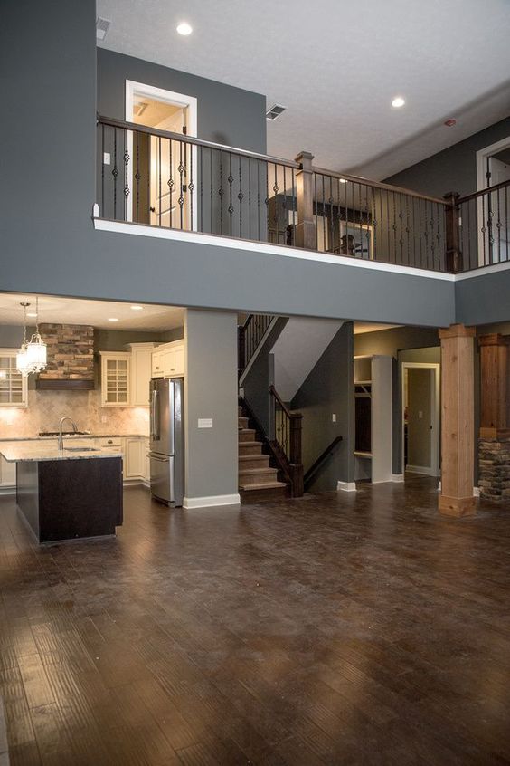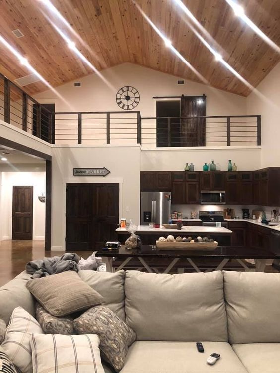 When considering barndominium ideas floor plans, the inclusion of a loft adds both aesthetic and functional value. The high ceilings with wooden accents create an airy feel, while the loft area serves as an additional living space that overlooks the main floor, perfect for a home office or a cozy reading nook.