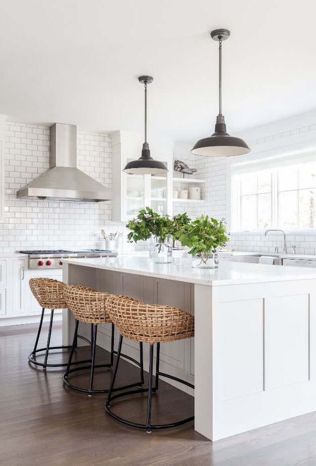 This kitchen design blends rustic charm with modern functionality. The white cabinetry and subway tile backsplash provide a clean, bright backdrop, while the wicker bar stools and dark metal pendant lights add a rustic touch. The stainless steel range hood and sleek countertops enhance the modern appeal, creating a balanced and inviting space that feels both timeless and contemporary.