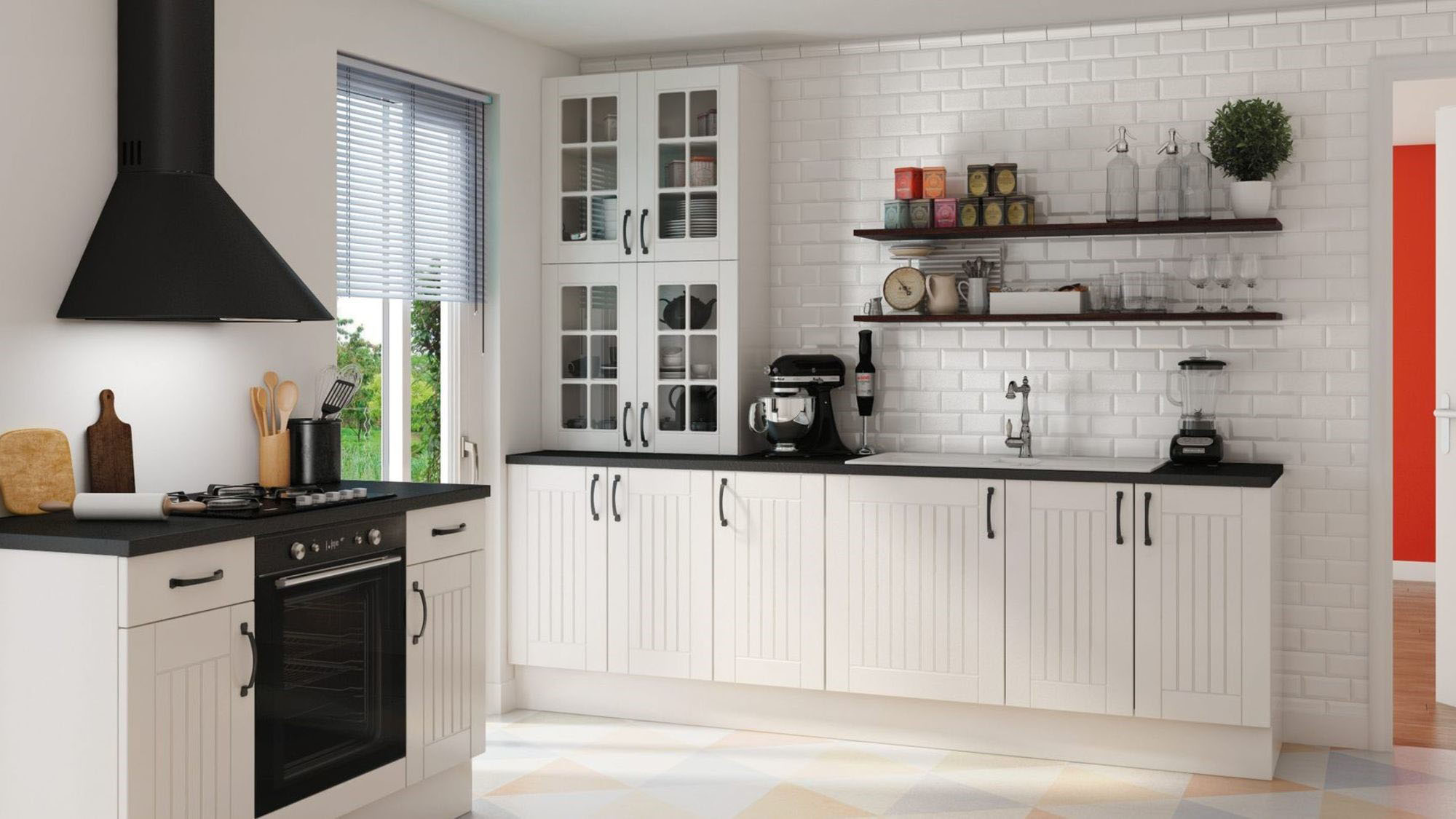 Embracing a minimalist design, this kitchen keeps it simple with flat-panel white cabinets and a light wood countertop. The geometric floor tiles introduce a playful element, adding visual interest without overwhelming the space. This kitchen’s layout is ideal for small spaces, utilizing every inch efficiently. The minimalist approach, combined with strategic pops of color, creates a fresh, modern look that’s both functional and stylish.