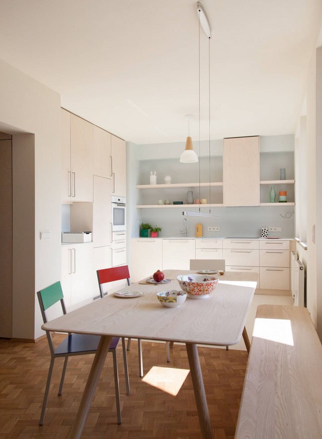Infusing playfulness and color, this kitchen features a mix of pastel and bold hues. The light wood cabinetry and open shelving provide a neutral base, while the colorful chairs and accessories bring a lively vibe. The minimalist design ensures the space remains airy and uncluttered, making it an excellent choice for those who love a cheerful and bright kitchen environment.