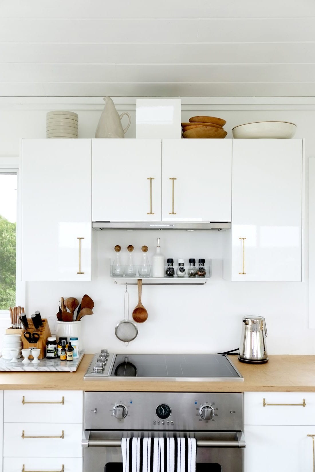 This kitchen embodies elegant simplicity with its glossy white cabinets and minimalistic design. The gold handles and fixtures add a touch of luxury, while the light wood countertop introduces warmth. The clean lines and uncluttered surfaces highlight the modern aesthetic, making this kitchen a perfect example of how simplicity can be both stylish and functional.