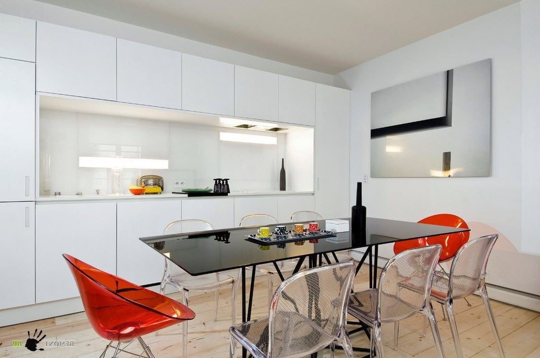 A bold take on modern design, this kitchen features high-gloss white cabinets and a striking black dining table. The transparent chairs and colorful accents add a playful touch, while the clean lines and open layout enhance the modern feel. This design is ideal for those who love to experiment with bold contrasts and contemporary styles in their kitchen decor.