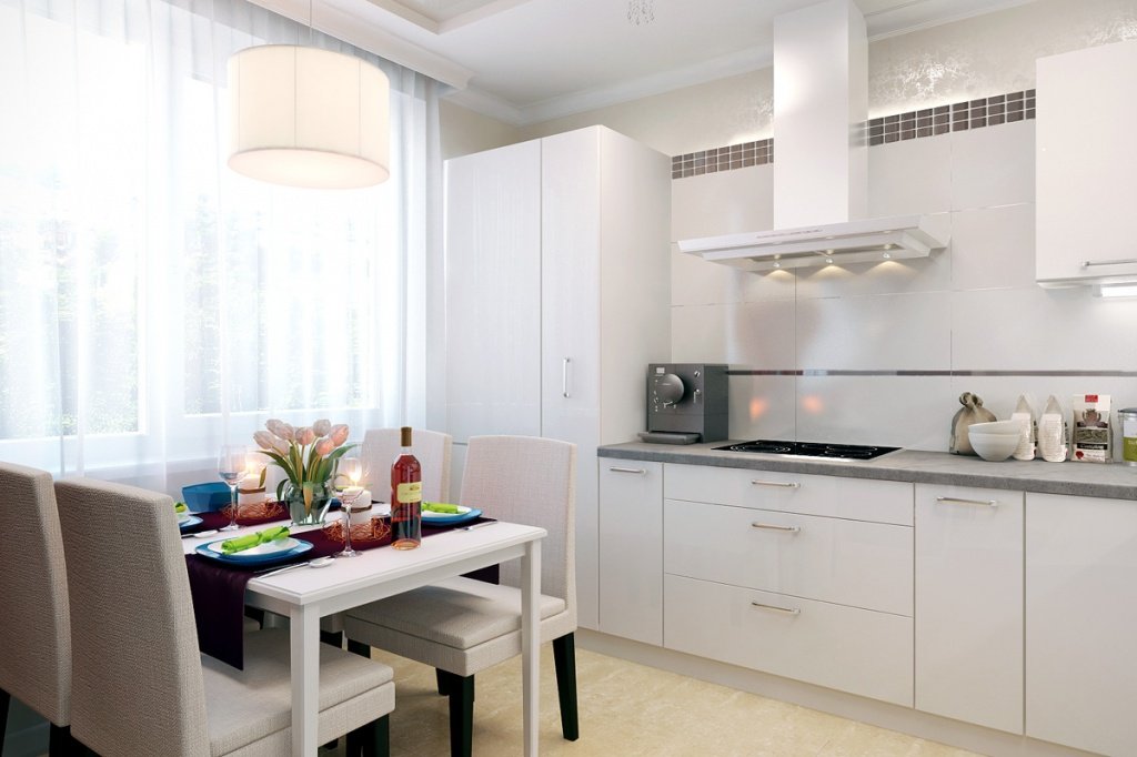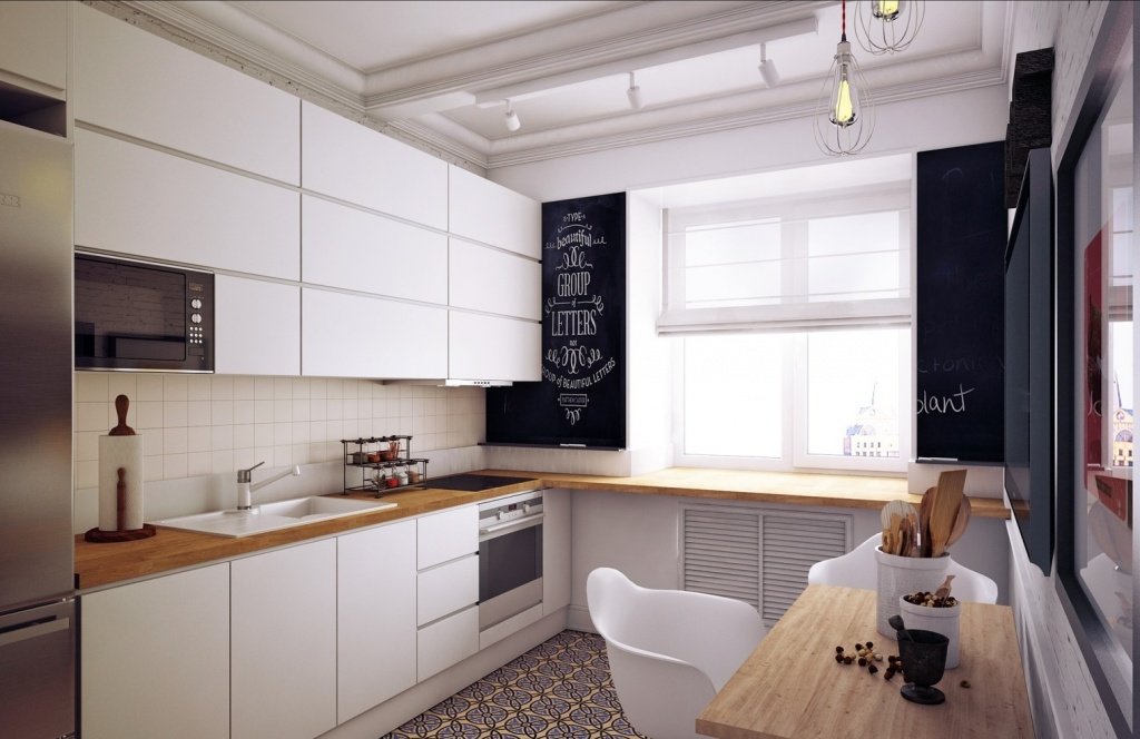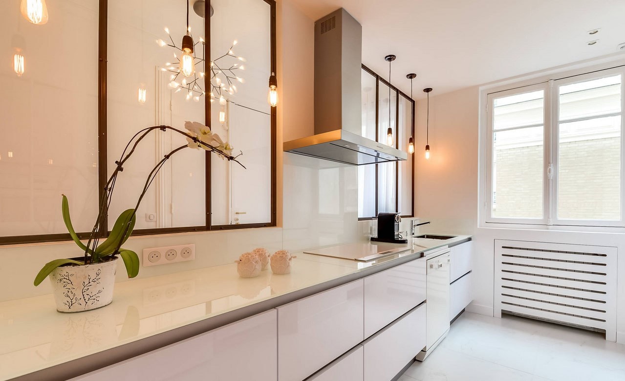 This kitchen combines industrial elements with chic design. The exposed light bulbs and sleek white cabinets create a modern, edgy look, while the black accents and metallic fixtures add industrial flair. The large windows ensure plenty of natural light, making the space feel open and airy. This design is perfect for urban dwellers who appreciate a blend of industrial and chic aesthetics.