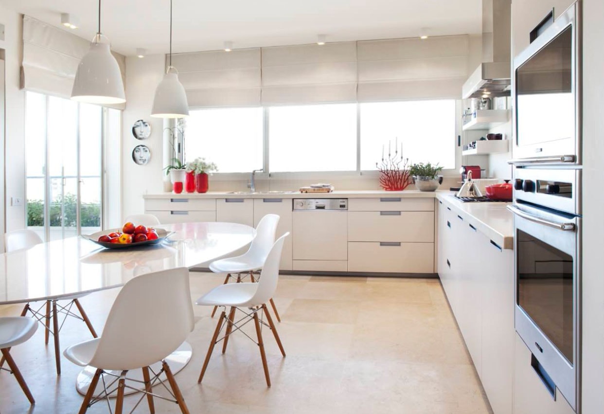 Incorporating a touch of femininity, this kitchen balances sleek, modern lines with soft, elegant details. The glossy white cabinets paired with a dark marble backsplash create a sophisticated contrast. The dining area, featuring a white table and plush chairs, adds a comfortable, feminine vibe, making it an inviting space for gatherings. The integration of artwork and a flower arrangement further softens the overall look, making this kitchen a harmonious blend of style and function.