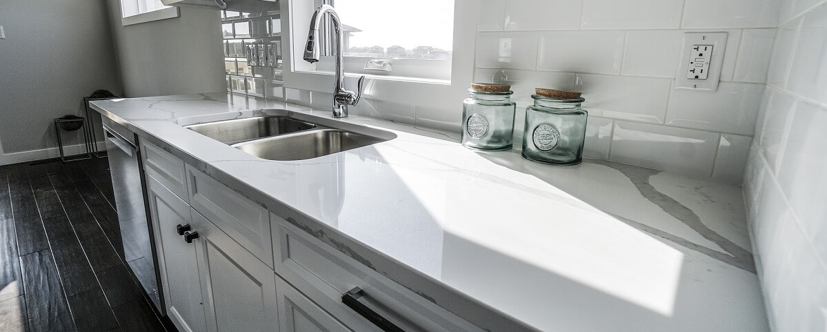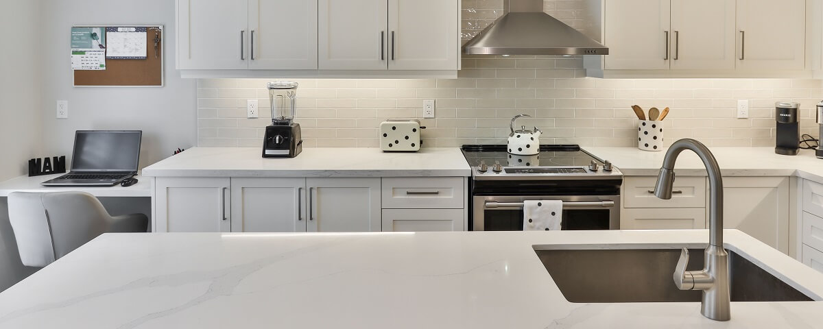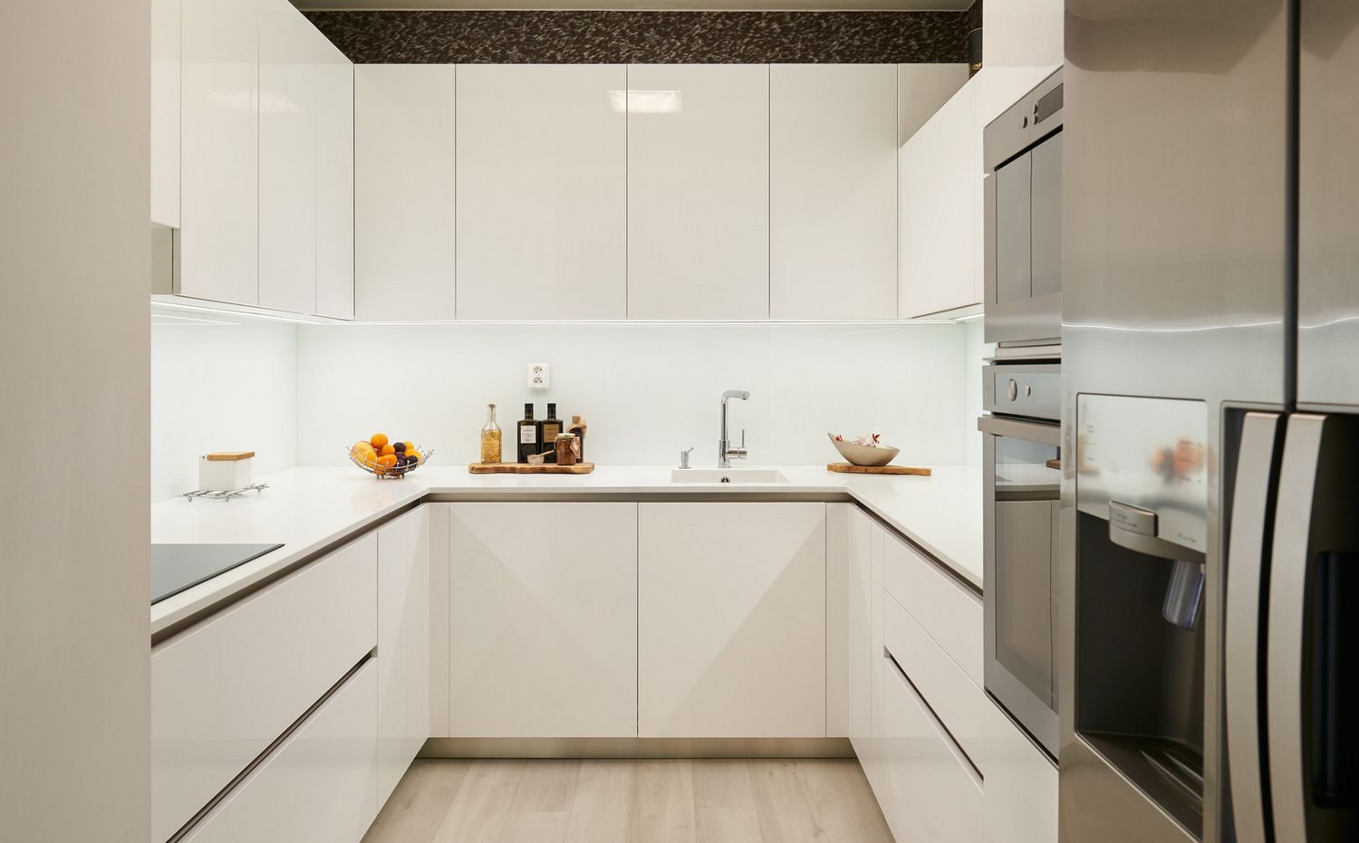 A sleek and bright design, this kitchen features glossy white countertops and a matching backsplash that reflects light beautifully, making the space feel airy and expansive. The dark wood flooring provides a striking contrast, grounding the overall look. The modern fixtures and clean lines enhance the minimalist aesthetic, creating a functional yet stylish kitchen that’s perfect for a contemporary home.