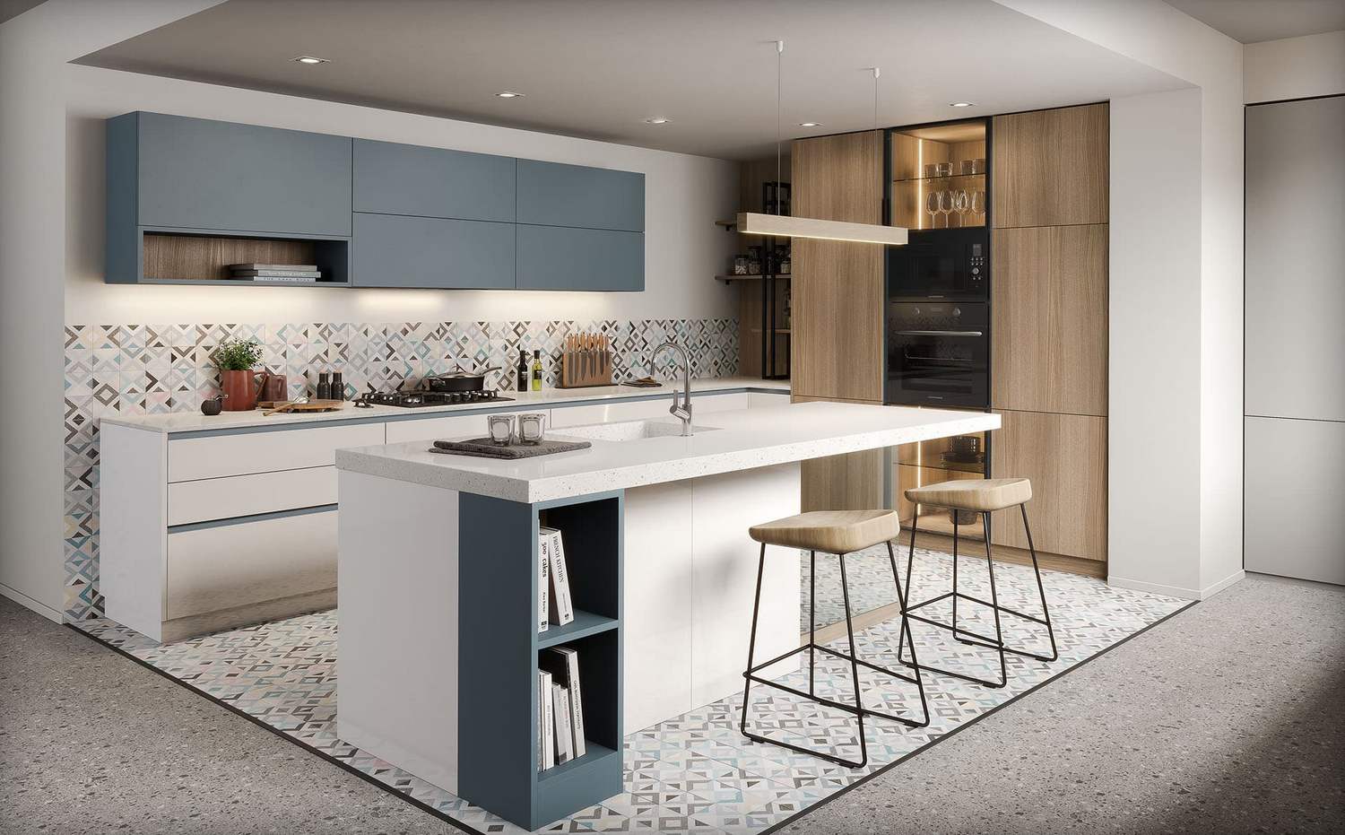 A beautiful blend of blue and wood elements, this kitchen embodies a modern rustic feel. The blue upper cabinets add a pop of color, contrasting with the white lower cabinets and light wood accents. The patterned backsplash ties the whole look together, giving the space a unique and personalized touch. This kitchen design perfectly balances modern color schemes with natural materials, creating a warm and inviting environment.