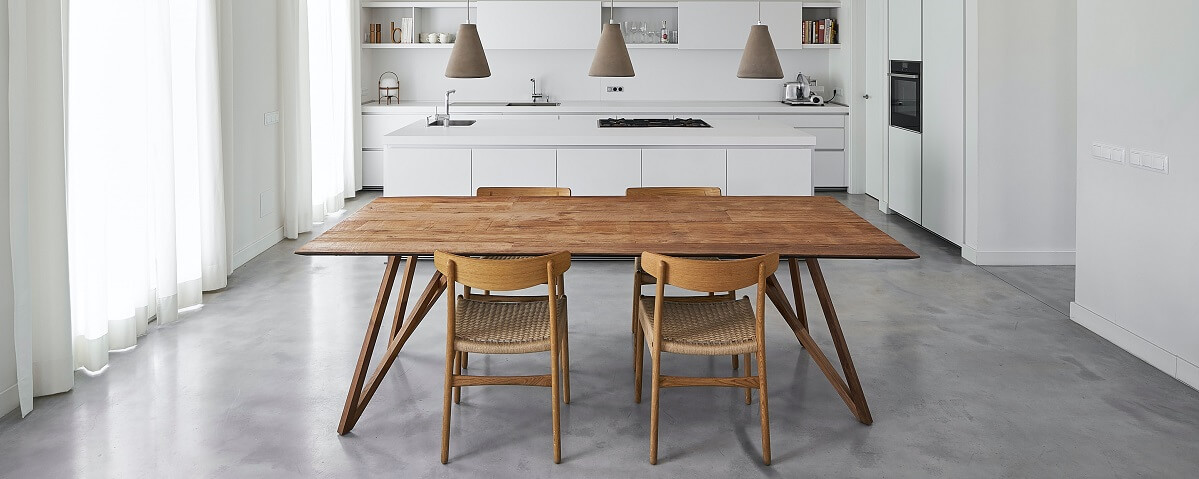 This kitchen perfectly blends modern simplicity with rustic charm. The white cabinetry and minimalist design are complemented by a natural wood dining table and woven chairs, adding warmth and texture to the space. The pendant lights above the island bring a touch of industrial style, creating a balanced and harmonious look. This design is ideal for those who appreciate a modern simple aesthetic with a hint of rustic elegance.