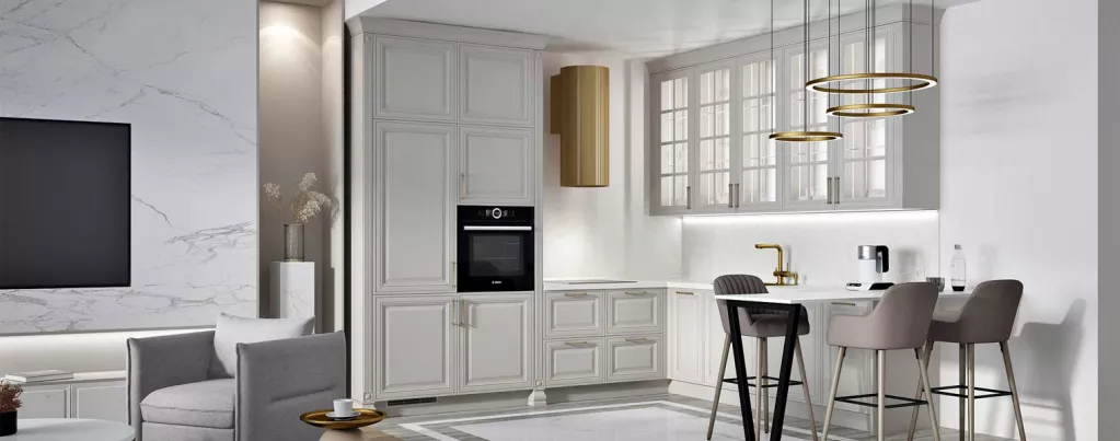 This luxurious kitchen design exudes elegance and sophistication. The white cabinetry is elevated by gold accents, including the pendant lights and faucet, adding a touch of opulence. The marble countertops and backsplash further enhance the luxurious feel, creating a kitchen that is both stylish and functional. This design is perfect for those who love a touch of glamour in their home, combining modern elements with classic luxury.